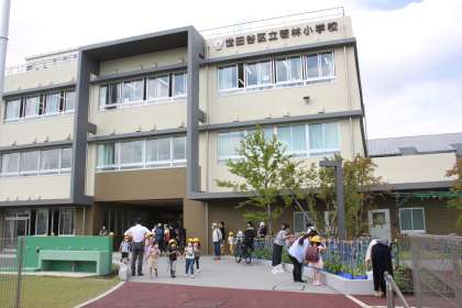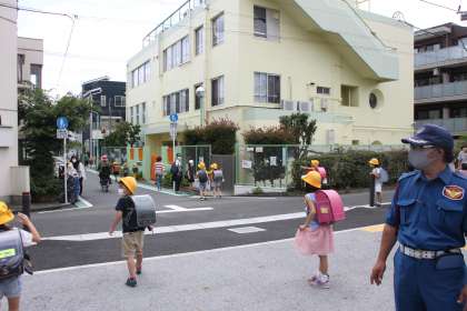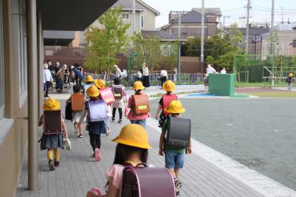 黄色い帽子の1年生は、給食後すぐに下校していきます。