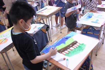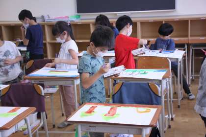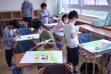 2年生が「行ってみたい島」をテーマに、水彩絵の具に挑戦です。