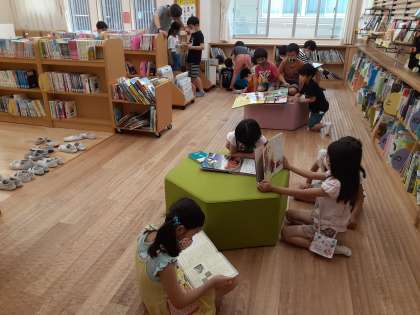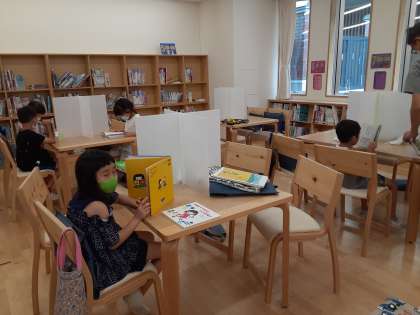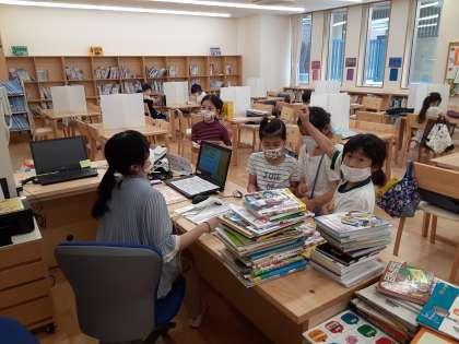 窓もドアも全開、換気もしっかりとできる若小の図書館です。