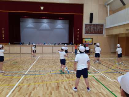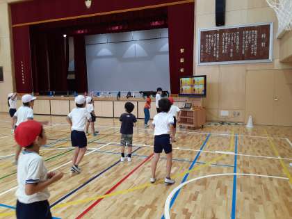 体育館体育での運動量を確保するために、4年生がダンスを踊っています。