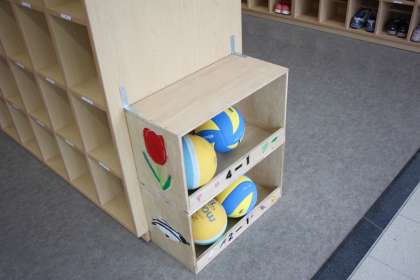 昨年度の卒業生がつくってくれたボール入れを設置したのです。