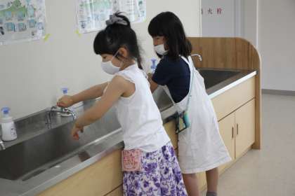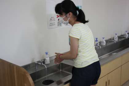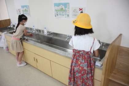 BGMに合わせて登校してきた子どもたちが、しっかりと手洗いをしています。