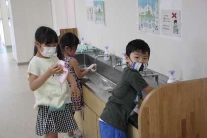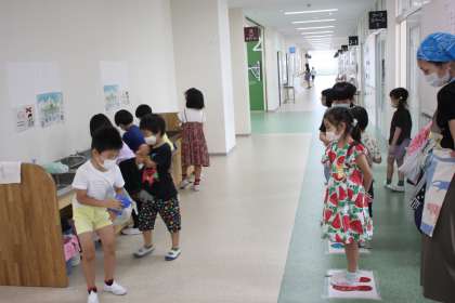 全員、改めて手洗いをしますが、ここでもきちんとソーシャルディスタンスを守ります。
