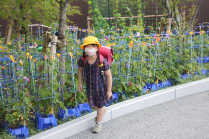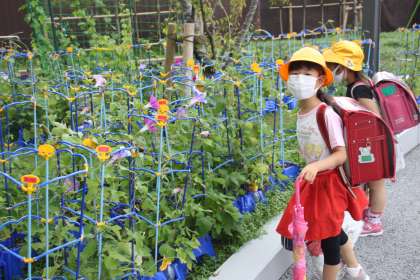 登校してきた1年生がまず行うのがアサガオのチェックです。