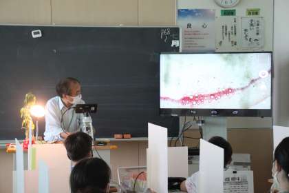 若小名物のデジタル顕微鏡で、大型モニターに細胞の様子が見えました。