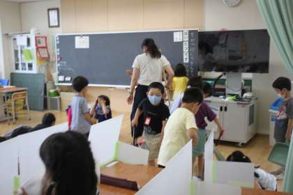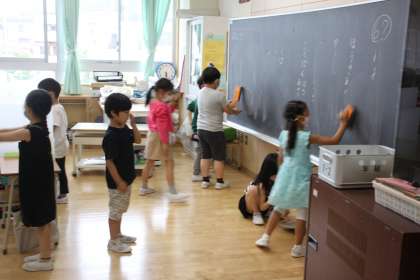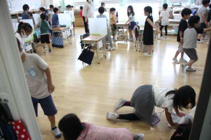 みんなでせっせと机を運び、ゆかをはき、ふきます。