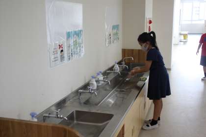 若小の新学校生活のひとつ、手洗いは、子どもたちに完全に浸透してます。