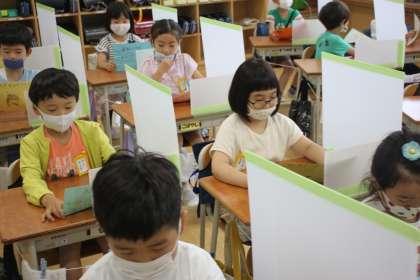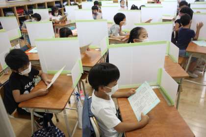 5年生から頂いた歌詞カードを観ながら、早速、校歌を歌った1年生たち。