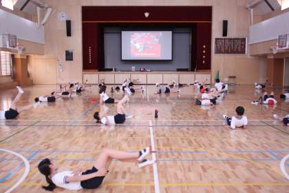 DVDを観ながらエクササイズを行う6年生たち。