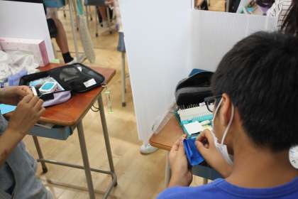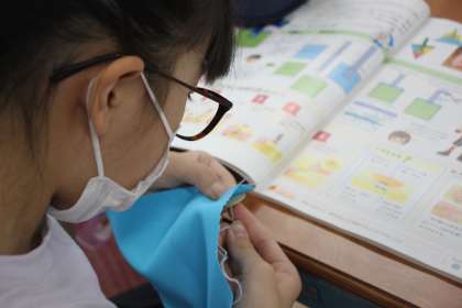 5年生が家庭科の学習でボタン付けをしています。