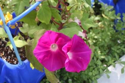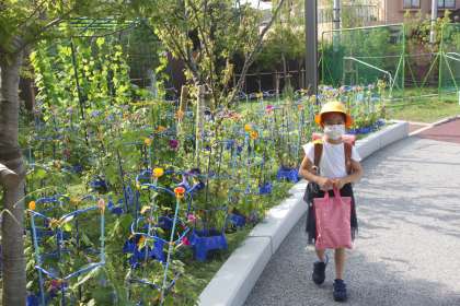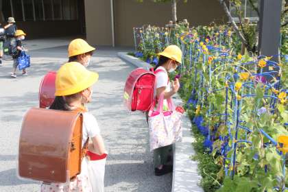 登校してきた子たちの目を楽しませてくれるアサガオ。