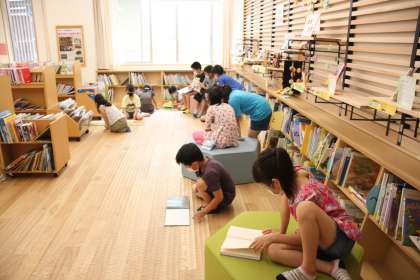 子どもたちは思い思いの場所で、静かに読書をしています。