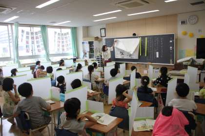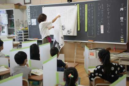 先生の用意した大きな拡大コピーを見ながら、どんなお話なのかを読み取ります。