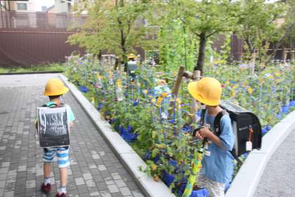 今朝も登校してきた1年生たちは、まずはアサガオのチェック!