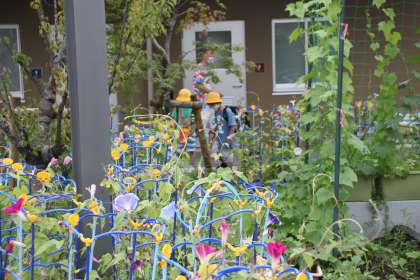 今年は雨が多く、日照不足と言われていますが、1年生の育てているアサガオは絶好調です。