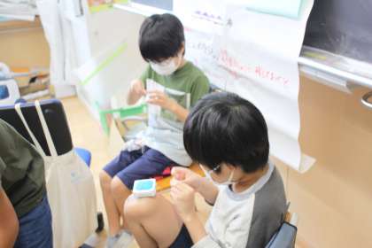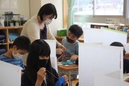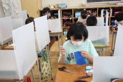 みんなで静かに針と糸を持ち、布に向かう5年生。