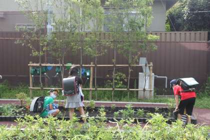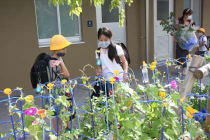 3年生は畑に植えられているホウセンカの開花状況をチェックしているようですね。