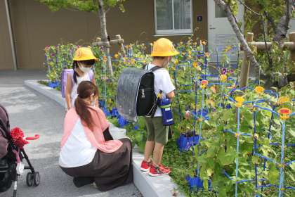 1年生は登校してくると、まずアサガオをチェック!