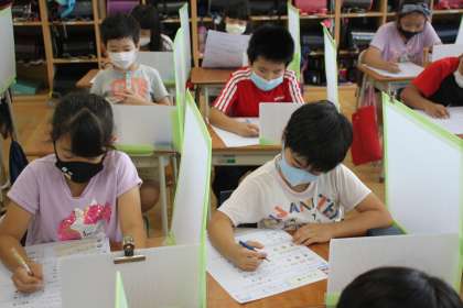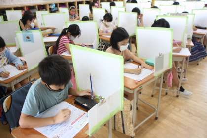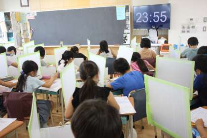 先生の用意した大型タイマーを見ながら、確実に問題に答えを書き入れていきます。