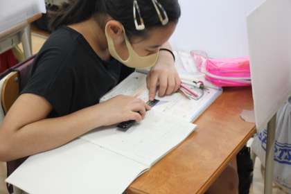 定規、コンパス、分度器を駆使し、可能な限り正確な作図を目指す5年生。