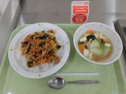 夏野菜の豚キムチ丼 冬瓜のスープ 牛乳