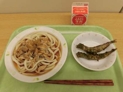 冷やしきつねうどん ししゃもの磯辺揚げ 牛乳