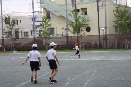 5年生たちは、体育のウォーミングアップに校庭で元気におにごっこをしています。