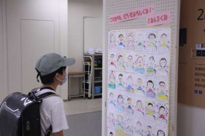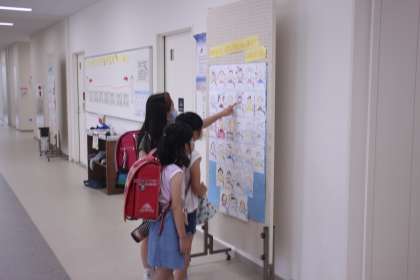 登校してきた子たちが多く目にしているのが、玄関に掲示されている1年生の「ありがとうカード」です。