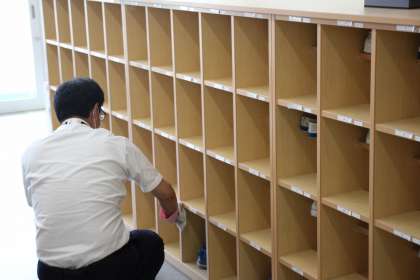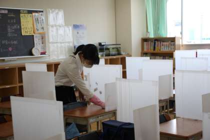 夏季特別学習会に参加してくれた子たちが下校した後、早速先生たちは、30分間の清掃・消毒作業に取り掛かります。