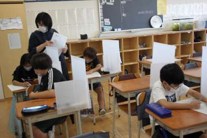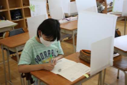 とても静かな教室内で、子どもたちがせっせとプリント課題に取り組みます。