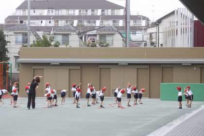 まずはあいさつ、次に準備運動です。
