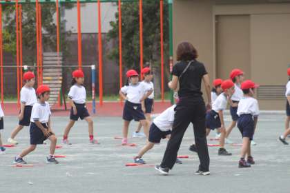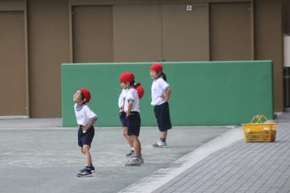 1年生が校庭で体育の活動をします。