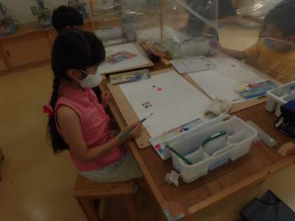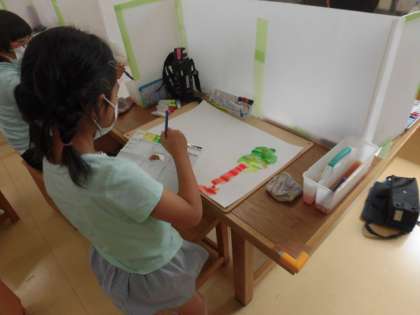 夏休みが明け、さっそく図工の授業が始まりました。クレヨンと絵の具のはじく関係を利用して、絵に色をつけました。久しぶりの図工も楽しく、集中して行えました。