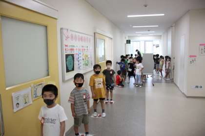 ソーシャルディスタンスを守りきちんと並べる若小の子達。