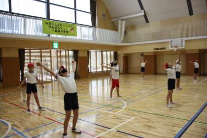 5年生が体育館体育の前に、ラジオ体操第一に取り組みました。