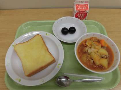 はつみつバタートースト ボルシチ 巨峰 牛乳
