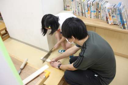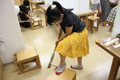 のこぎりを使って、木材を切り、やすりをかけて滑らかにします。