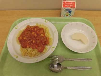 チリビーンズライス 梨 牛乳