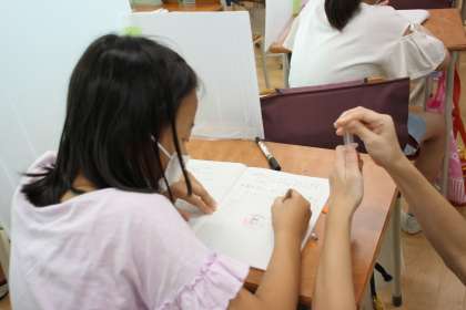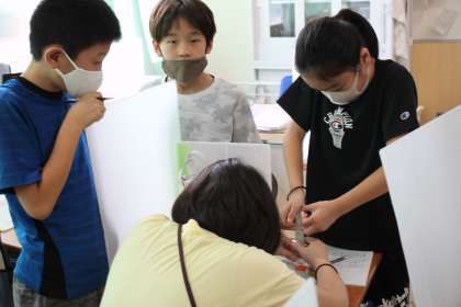4年生がピストンとシリンダーを使って、空気の性質を調べています。