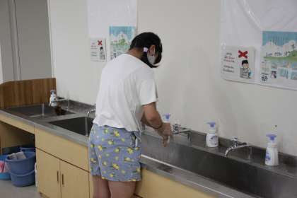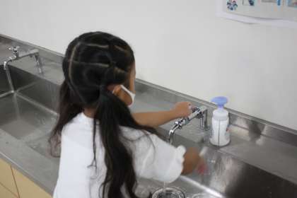 低学年から高学年まで、登校したらまずは手洗い。