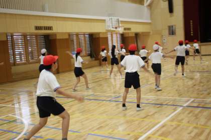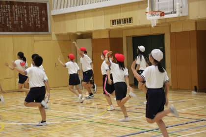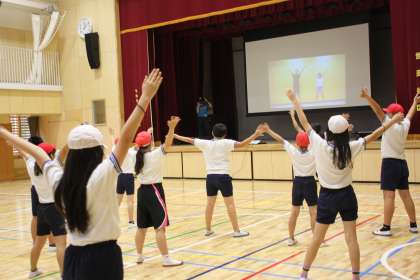 スクリーンに映ったお手本に合わせて踊る6年生。