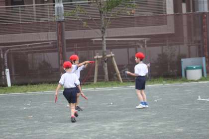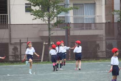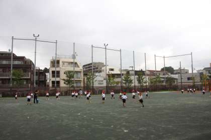 雨が今にも降りだしそうですが、急いで体育の学習を始めます。