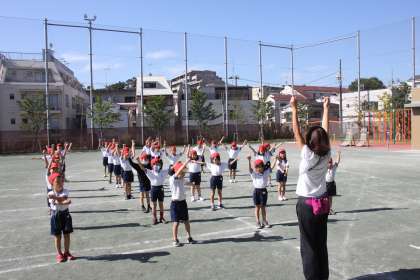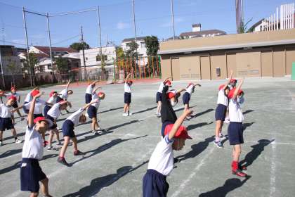 1年生が体育の準備運動に、ラジオ体操をしました。