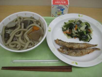 けんちんうどん ししゃもの唐揚げ ワカメサラダ 牛乳