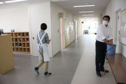 子どもたちが下校した後の学校では、先生たちが消毒作業を行います。