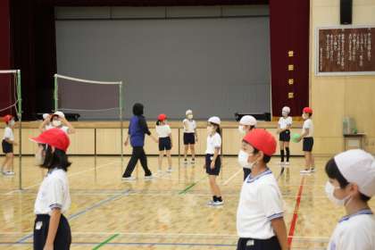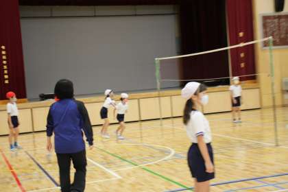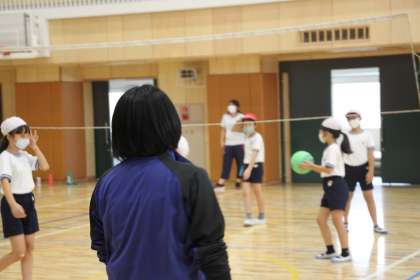 ソフトバレーボールを題材とした学習ですが、まだ慣れていない子たちにも取り組みやすくするために、少しずつルールを変えながら試合をします。