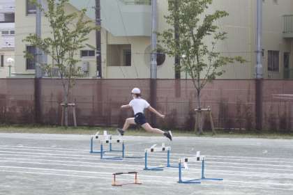 自分の歩幅に合ったハードル間隔を見つけて、記録に挑戦します。