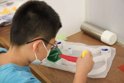 ボール紙にカラーセロファンで色を付けていきます。
