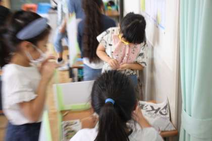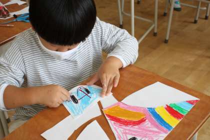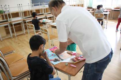 2年生が画用紙を使ったパズルづくりを楽しんでいます。