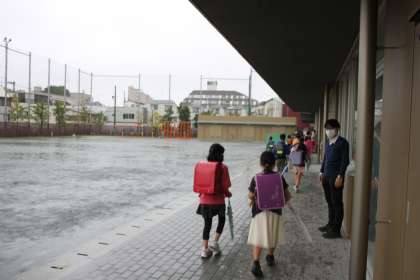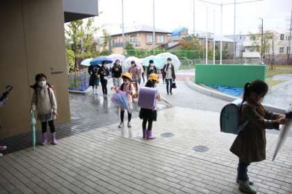 松陰ストリートのピロティで傘をたたみ、ひさしの下を歩いていきます。